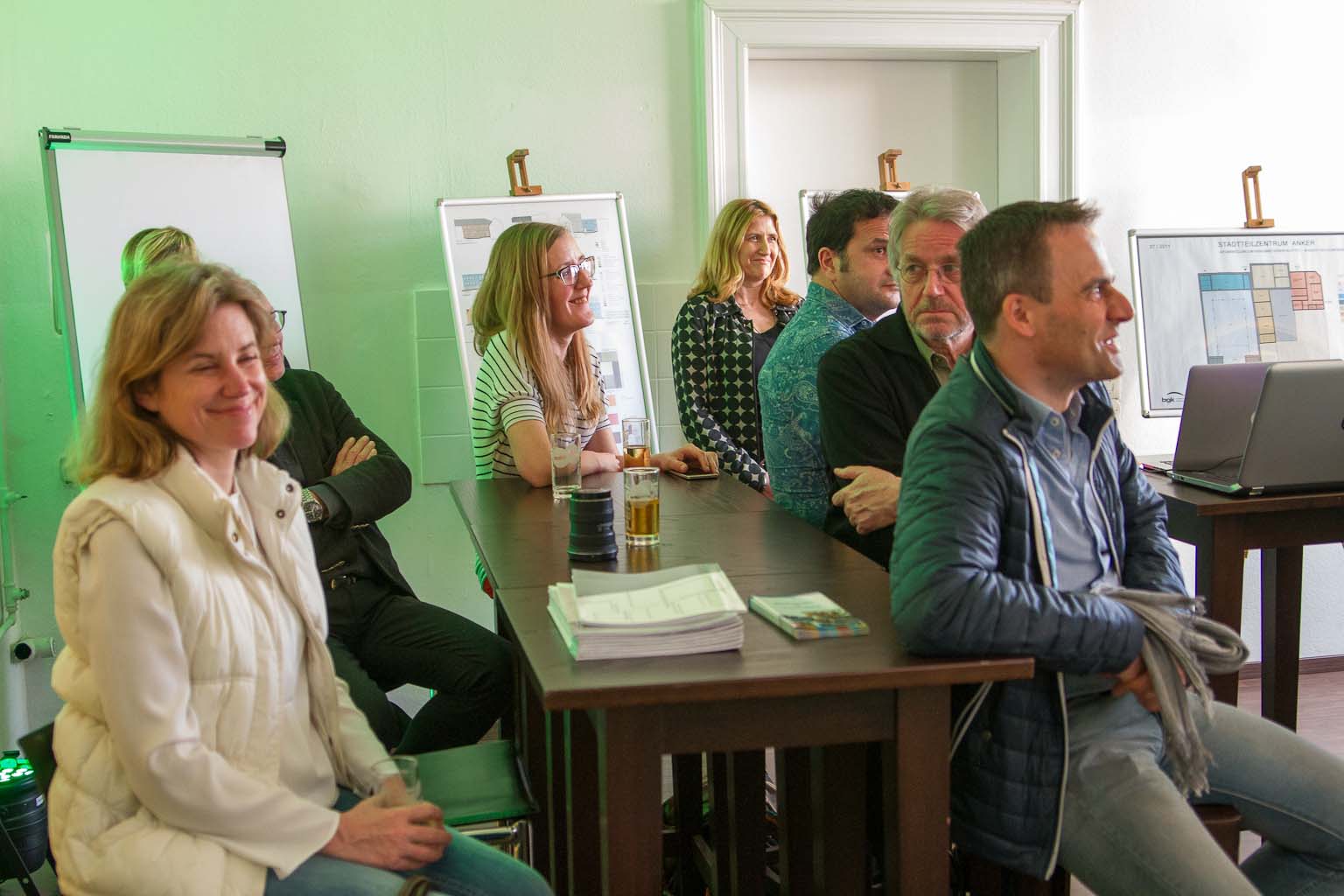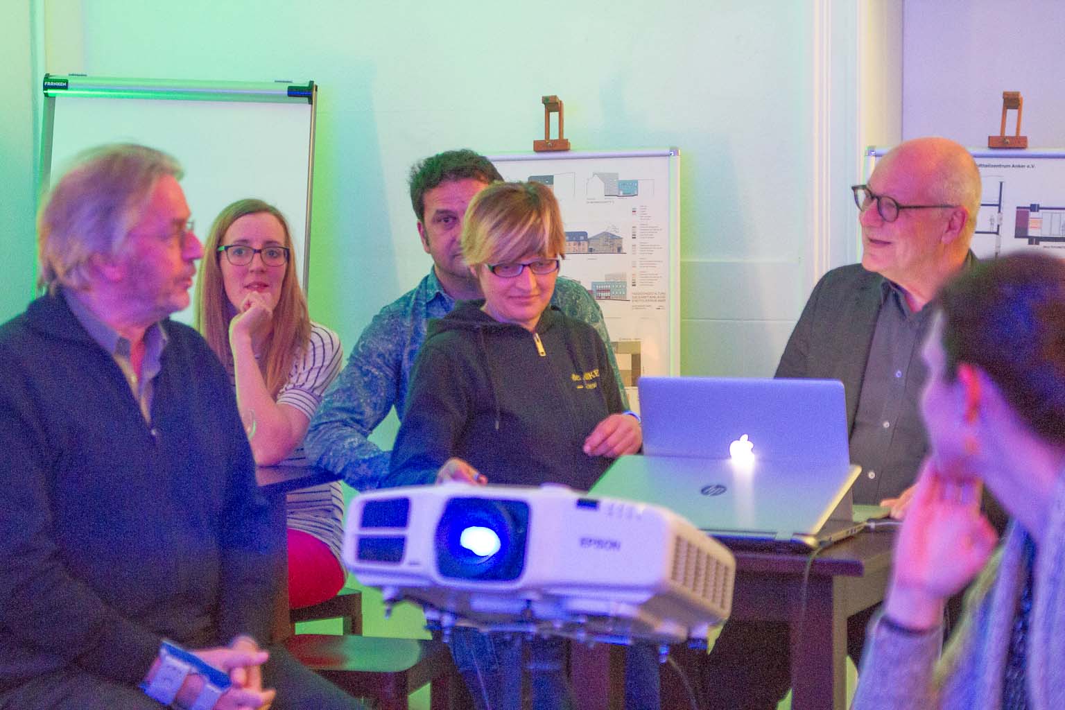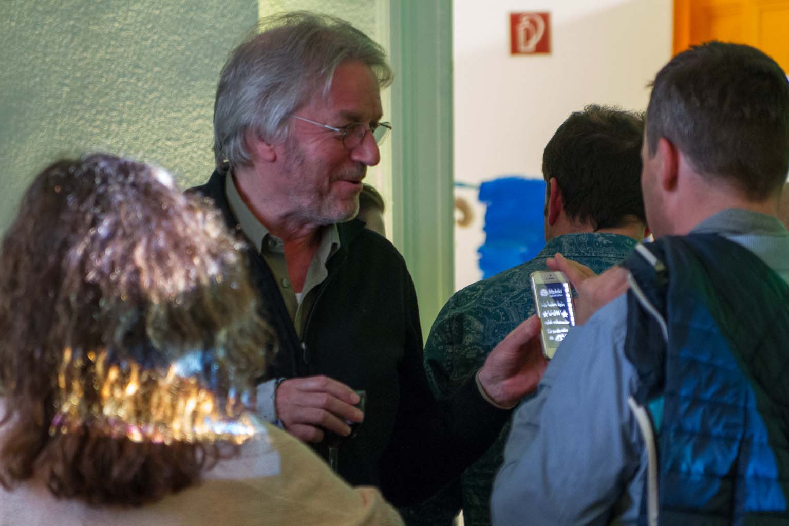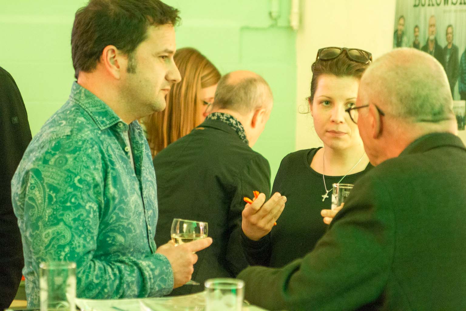 Vor dem Rundgang durch den Interimsstandort des Anker e.V. gab diesmal Maike Steuer einige Informationen zur „Nacht der Kunst“ bekannt. Danach wurden die gesammelten Eindrücke wie gewohnt bei Buffet und Bar ausgetauscht und diskutiert.