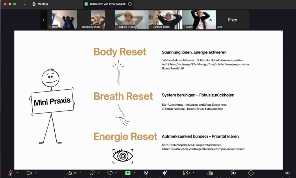 Im aktiven Part ging es dann um spürbare Praxis: Mini-Resets, bewusste Atmung, kleine Bewegungsimpulse – und das Gefühl, wieder bei sich anzukommen.