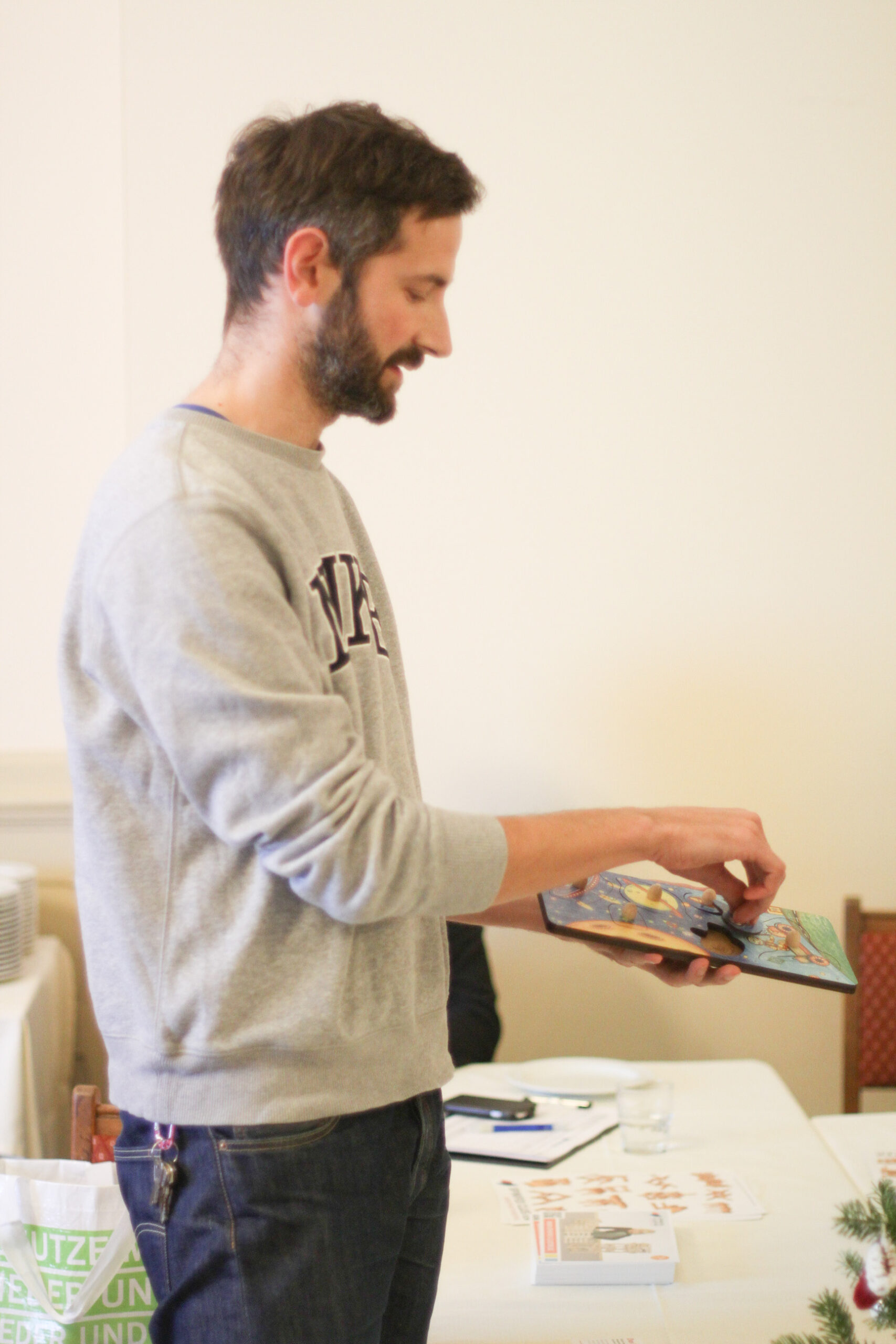 Auf ungewöhnlichem Wege gelangte das Stempelspiel „Basic Stamp Game“ von Claudia Richardt in die Produktion der Lindenwerkstätten. Denn zunächst war die Herstellung bei kleinen Stückzahlen so kostenintensiv, dass die ersten Stückzahlen in Asien produziert wurden. Weil Fertigung und Transport aber verschiedene Fehler hervorriefen, nahm man die Unterstützung der Lindenwerkstätten zunächst quasi als Reparaturservice in Anspruch. Mittlerweile ist das anders, berichtete Dimo Gugutschkow.