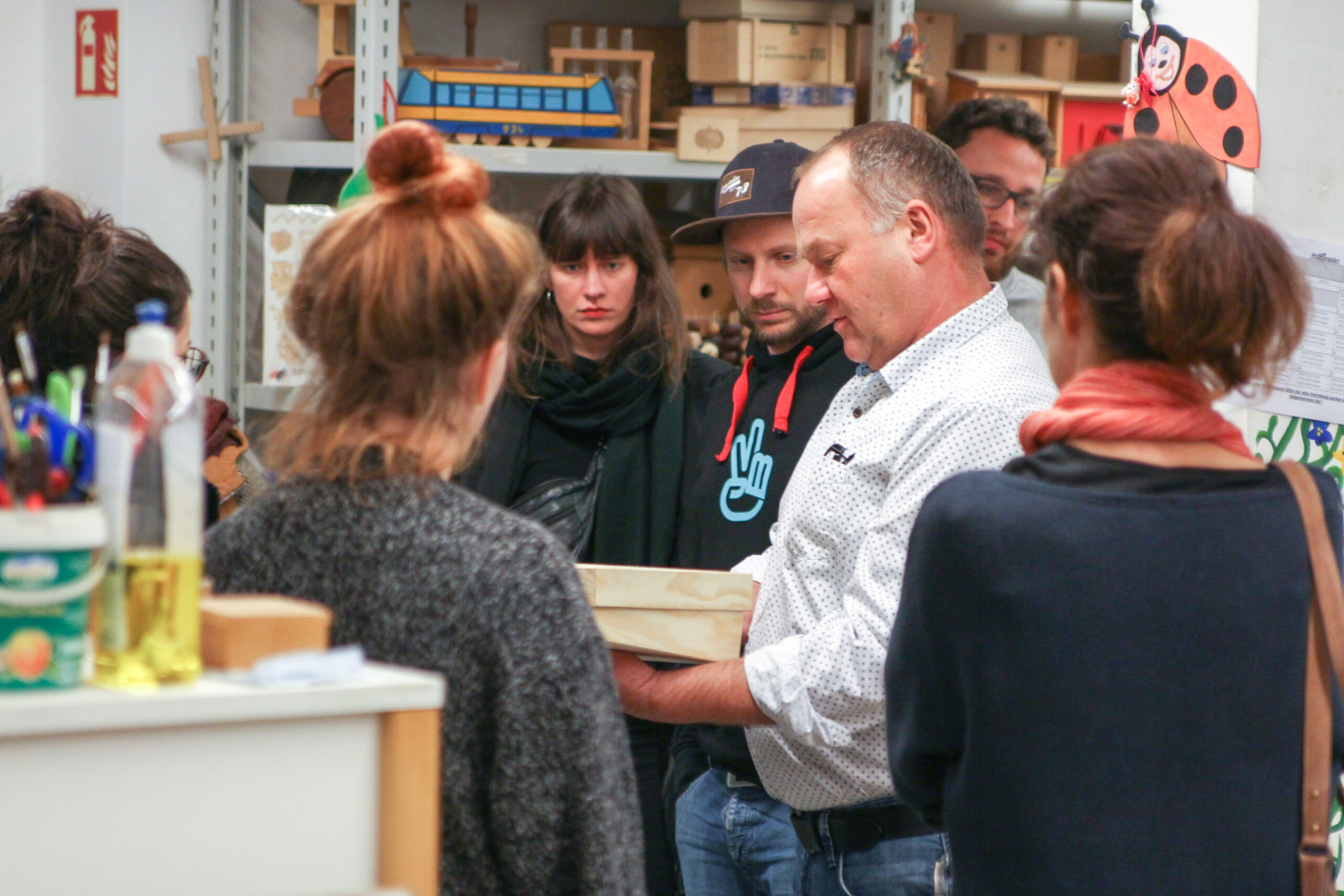 Denn am Ende des Abends konnten wir auf dem Rundgang durch die Räumlichkeiten live erleben, wie es in dem besonderen Betrieb aussieht. Neben einer neuen Perspektive auf unseren Begriff von Arbeit wurden schließlich einige Unternehmer gleich inspiriert, welche Möglichkeiten zur Kooperation es gibt. Eine Lösung findet man in den meisten Fällen, hieß es. Das Hauptproblem lautet dabei nicht anders als bei „normalen“ Betrieben: Zeit. Denn die Werkstätten sind in den meisten Bereichen schon weit ausgelastet.