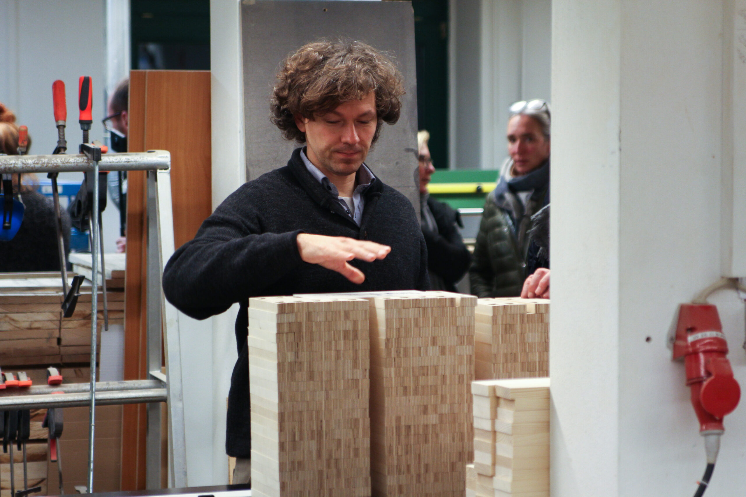 Mit welchen Projekten, das erfuhren wir anschließend beispielhaft in drei Kurzvorträgen. Sebastian Kalies lässt seinen beliebtes Holzspielzeug unter dem Namen Spinifex Cluster bereits seit längerem in der Diakonie produzieren. Alleine die verschiedenen Kanten der Bausteine werden von unterschiedlichen Anbietern gefräst, erklärte der Produktdesigner. 2013 wurde Spinifex Cluster für einen Designpreis nominiert. Seitdem hat er das Stecksystem weiterentwickelt und neue Vertriebswege gefunden.