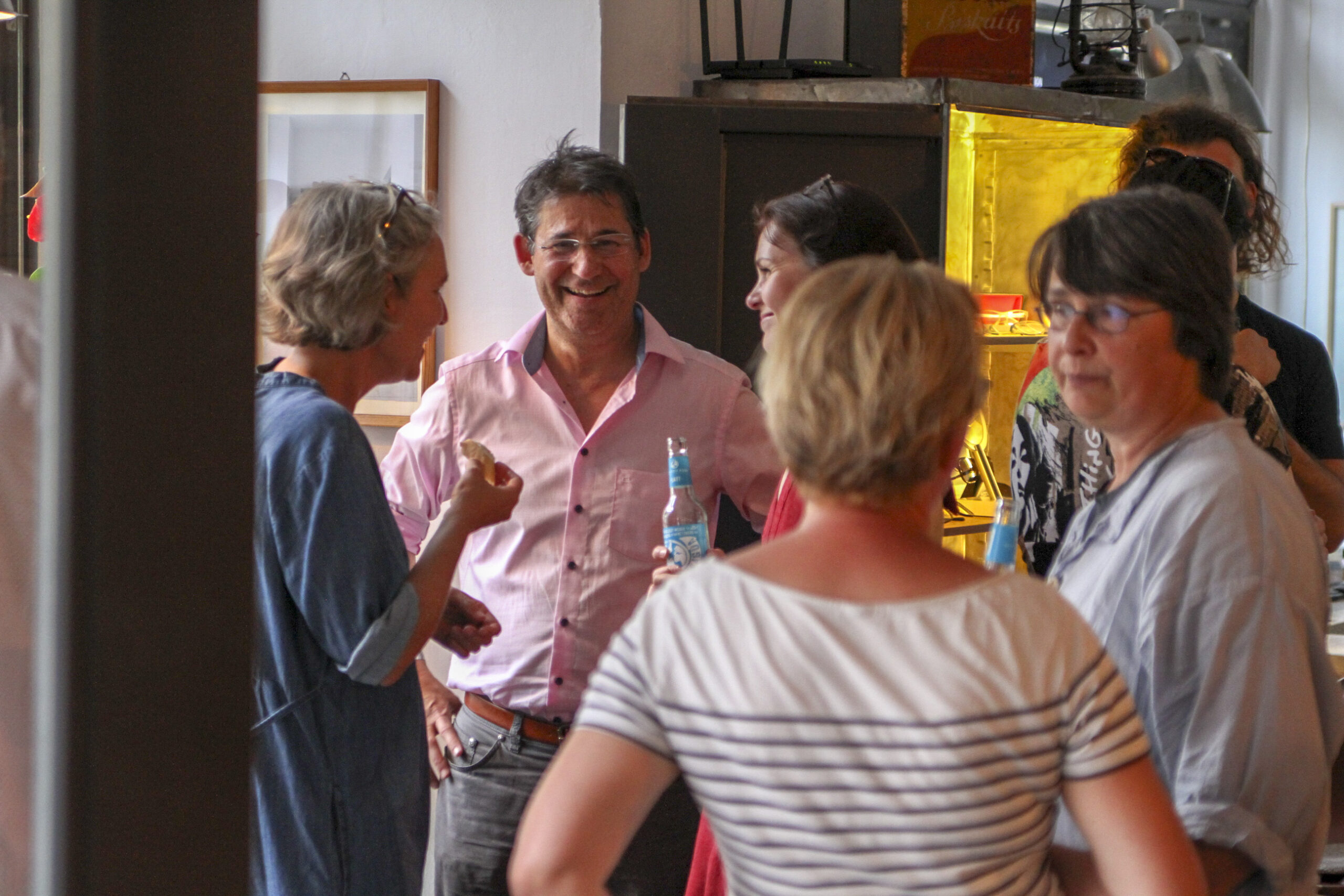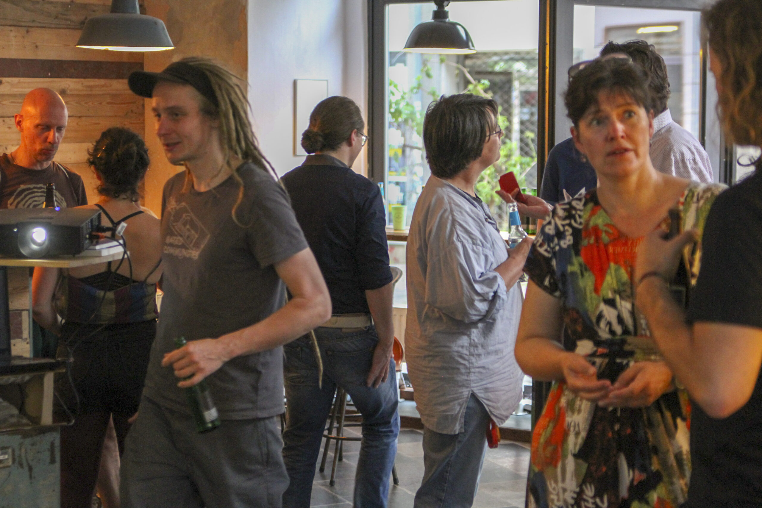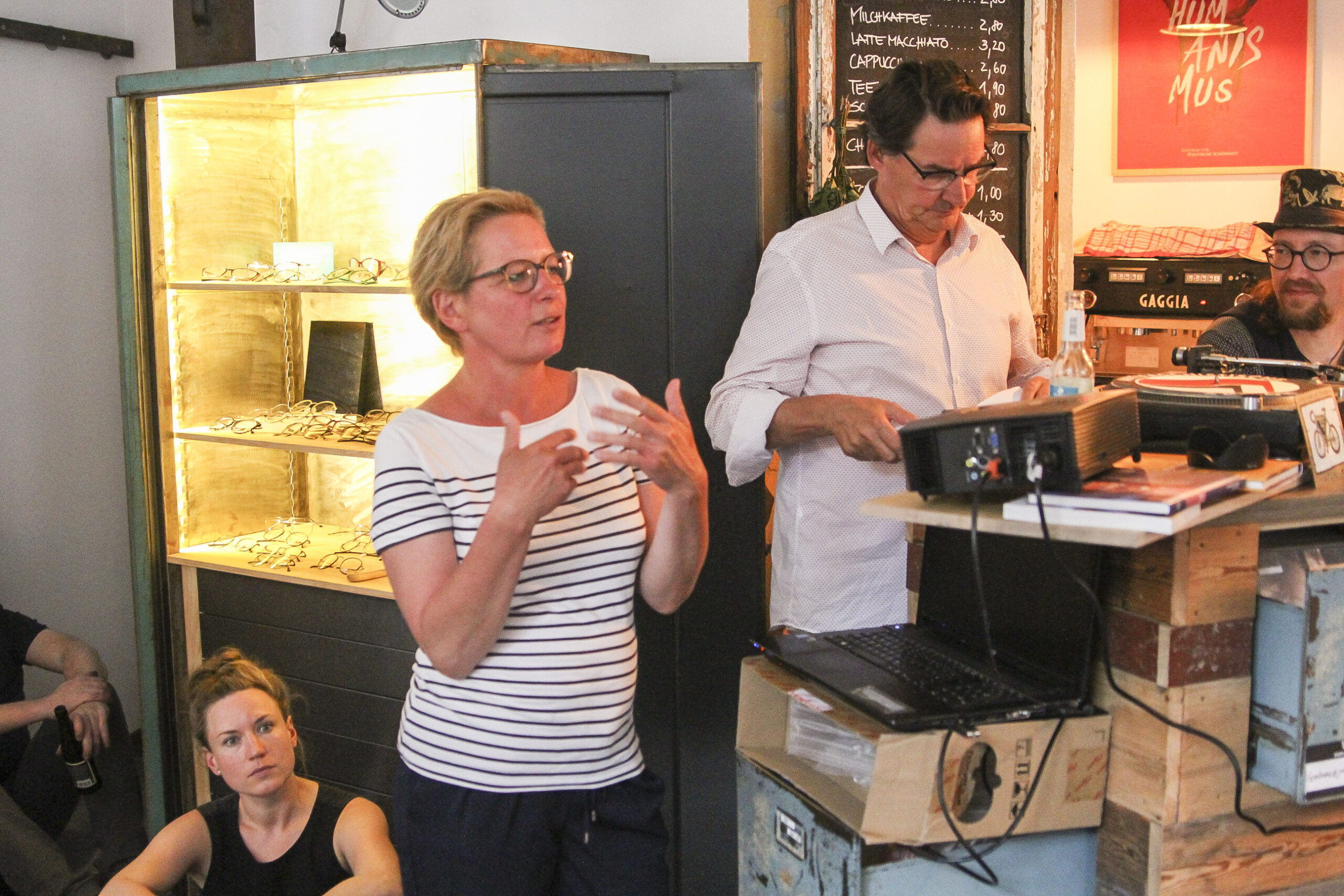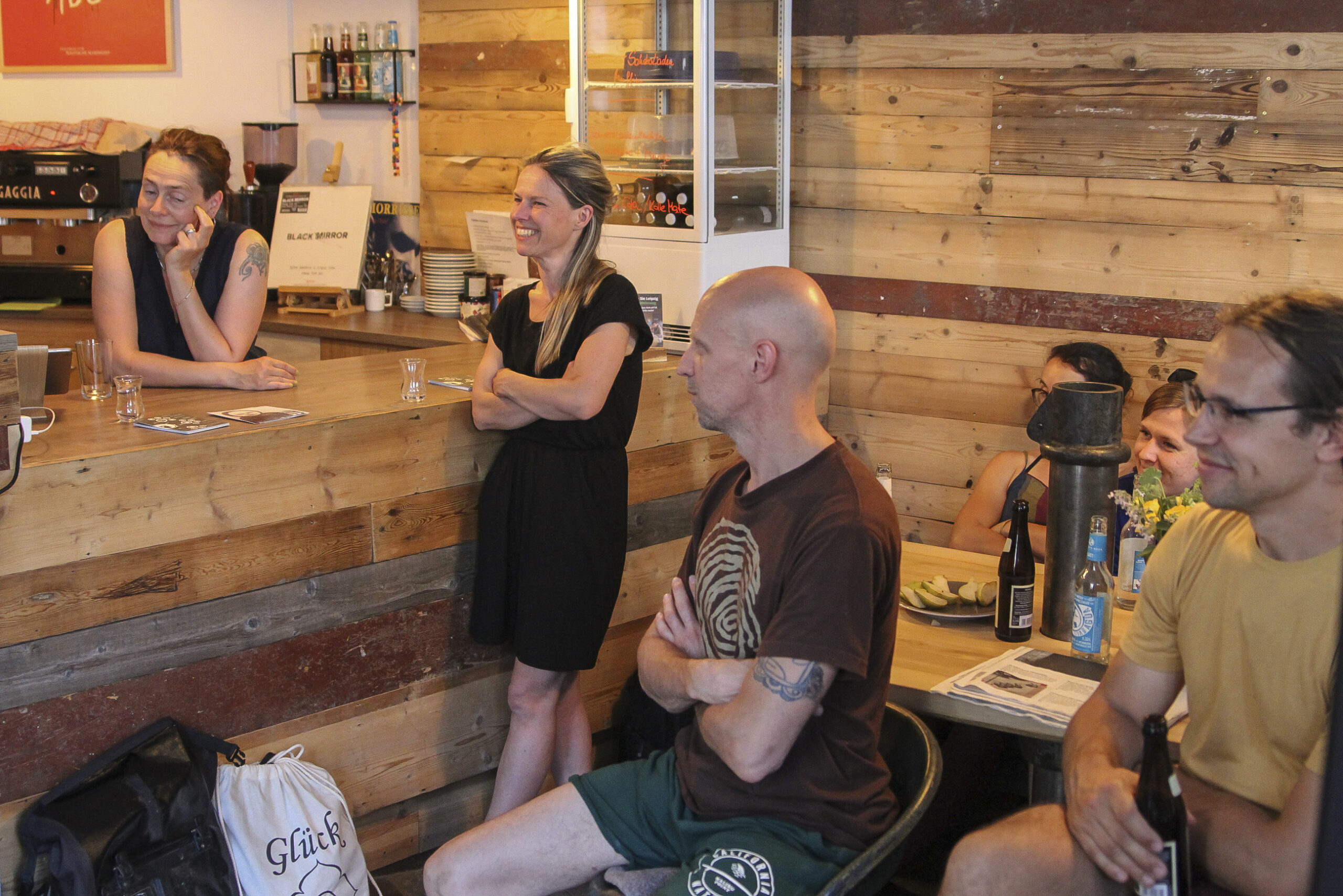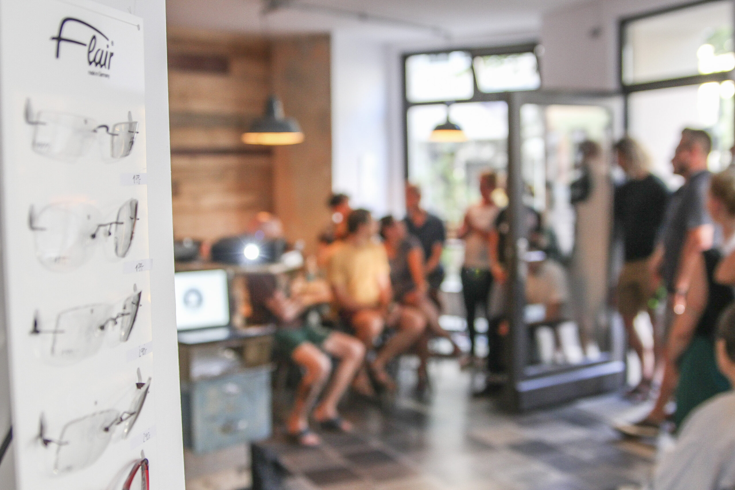 Trotz reichlich sommerlichen Temperaturen fanden sich mehr als 30 Teilnehmer zum Netzwerken bei Glas & Bohne. Denn einen Blick hatten die meisten bislang nur von außen auf das ungewöhnliche Optiker-Café geworfen. Felix Frenzel und sein Compagnon Christoph erzählten ihre Gründergeschichte. Ein kurzer, aber tiefer Einblick, wie schnell aus einer Idee zur richtigen Zeit mit einer Portion Mut etwas Langfristiges entsteht. Denn ein so investitionsintensives Vorhaben mit einigen kostspieligen Anschaffungen schüttelt man nicht eben so aus dem Ärmel.
