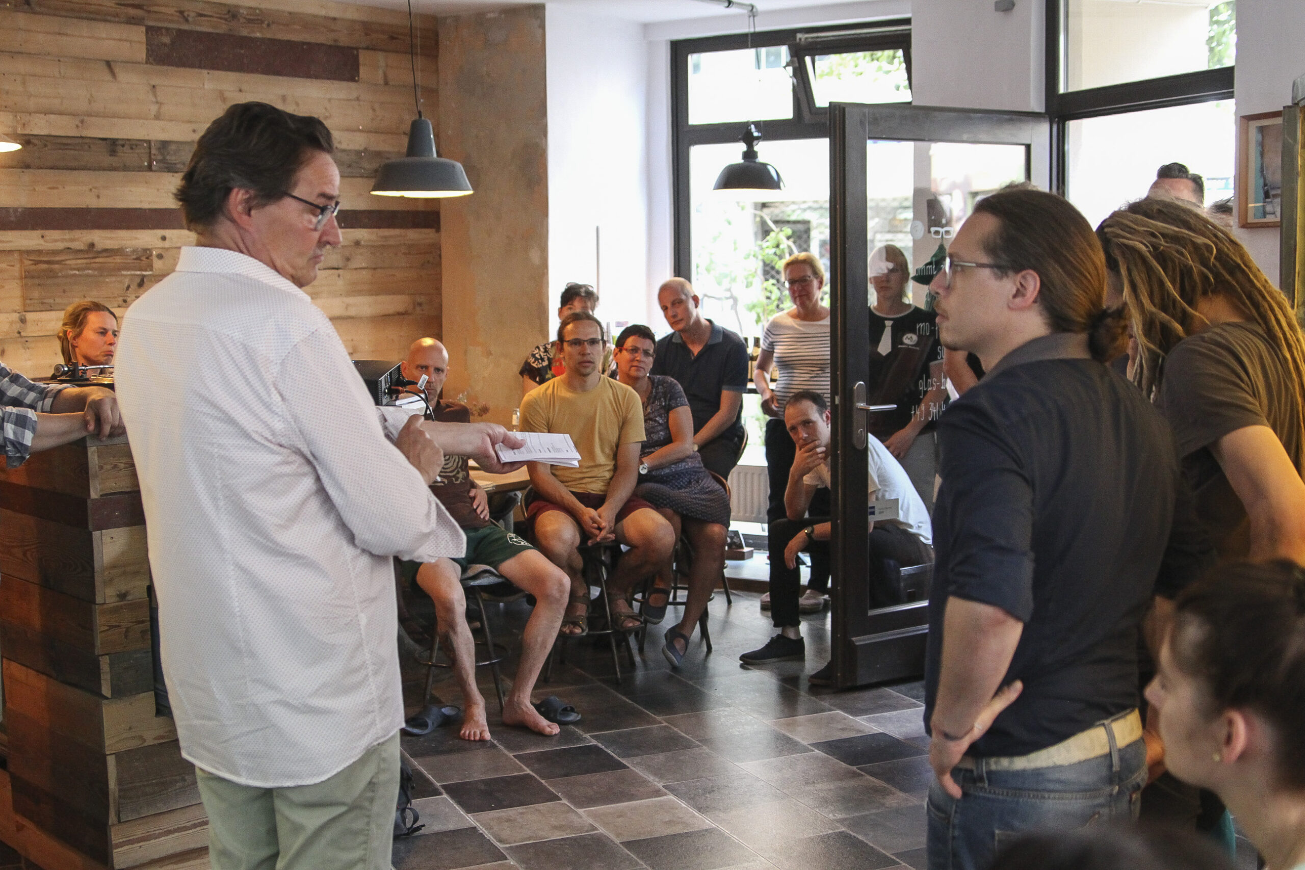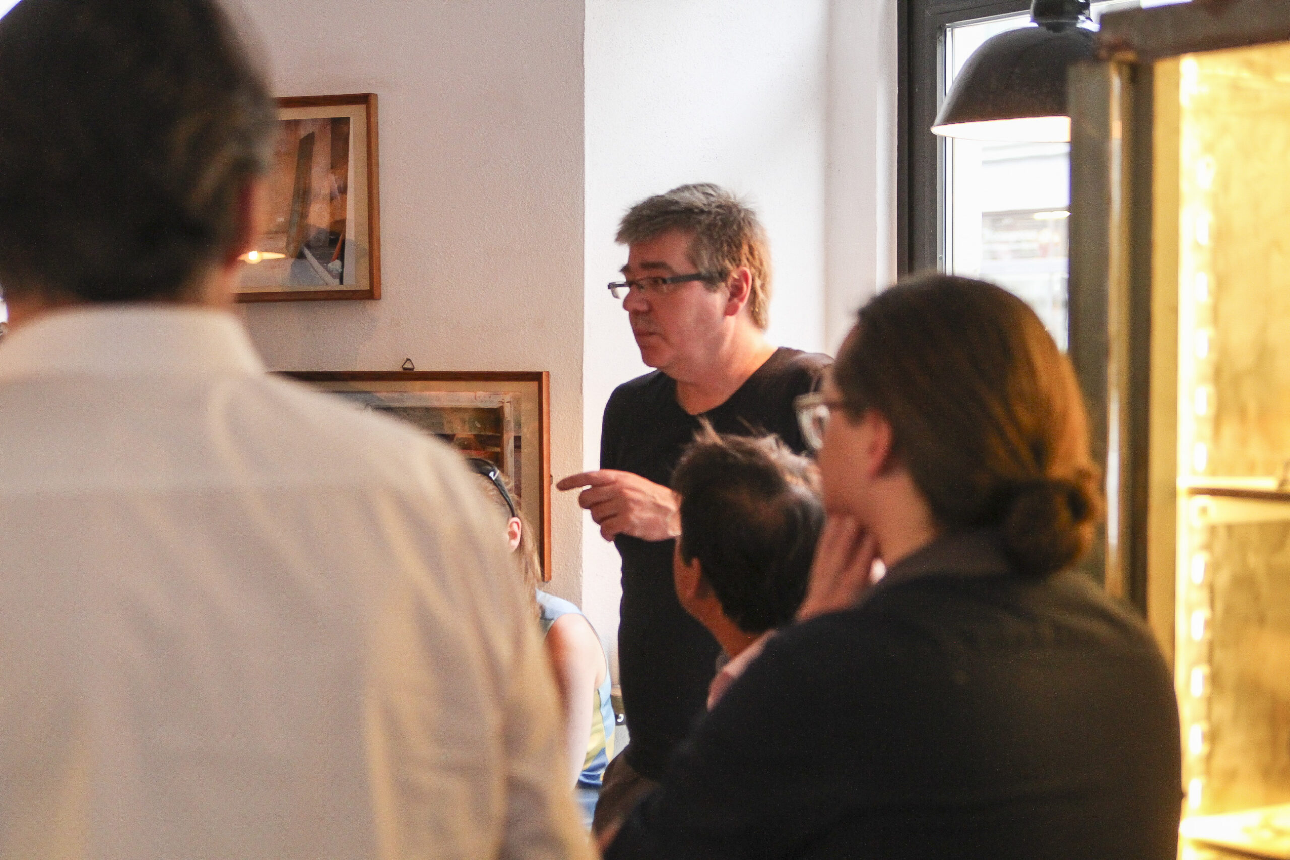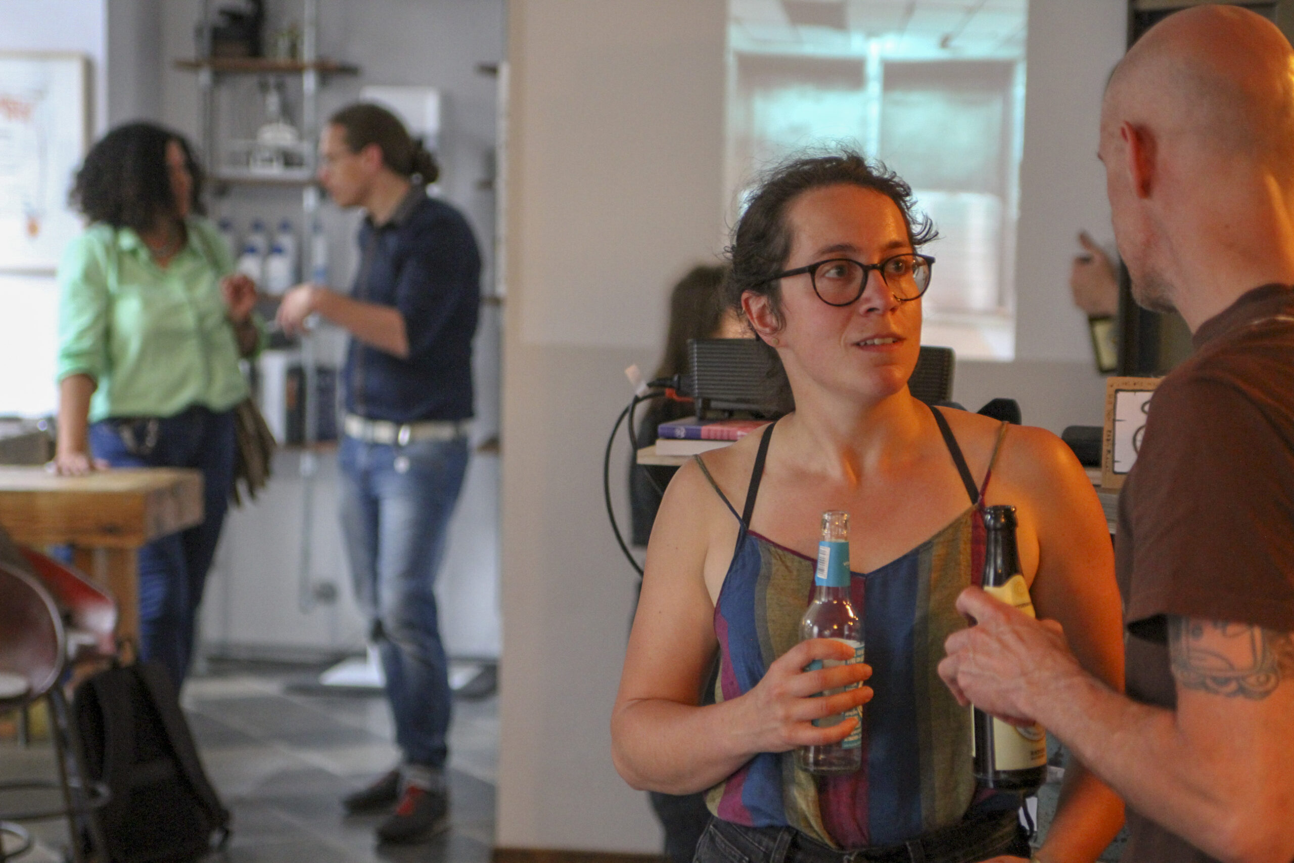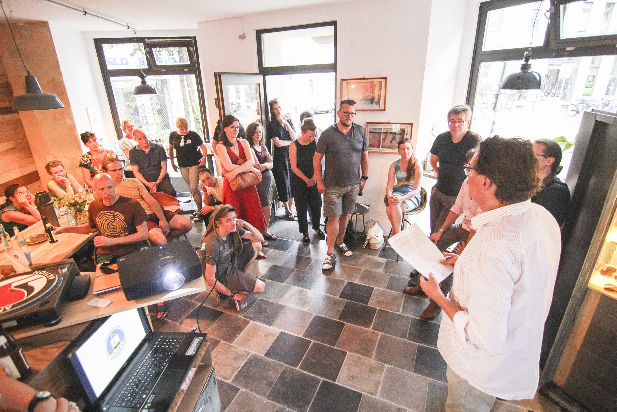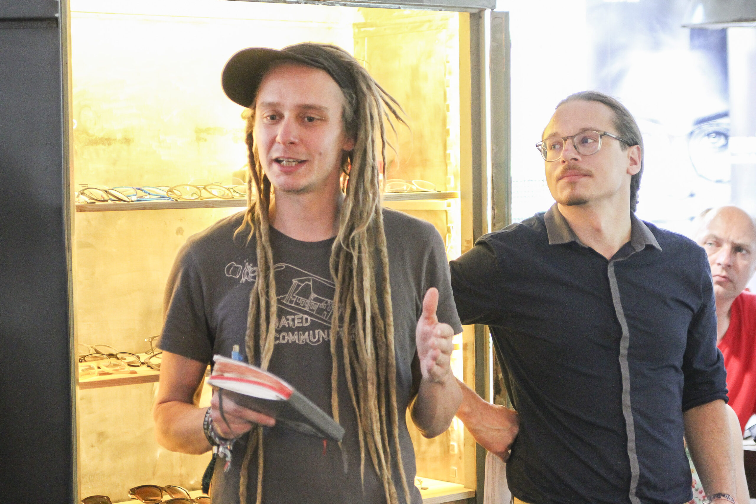 Trotz reichlich sommerlichen Temperaturen fanden sich mehr als 30 Teilnehmer zum Netzwerken bei Glas & Bohne. Denn einen Blick hatten die meisten bislang nur von außen auf das ungewöhnliche Optiker-Café geworfen. Felix Frenzel und sein Compagnon Christoph erzählten ihre Gründergeschichte. Ein kurzer, aber tiefer Einblick, wie schnell aus einer Idee zur richtigen Zeit mit einer Portion Mut etwas Langfristiges entsteht. Denn ein so investitionsintensives Vorhaben mit einigen kostspieligen Anschaffungen schüttelt man nicht eben so aus dem Ärmel.