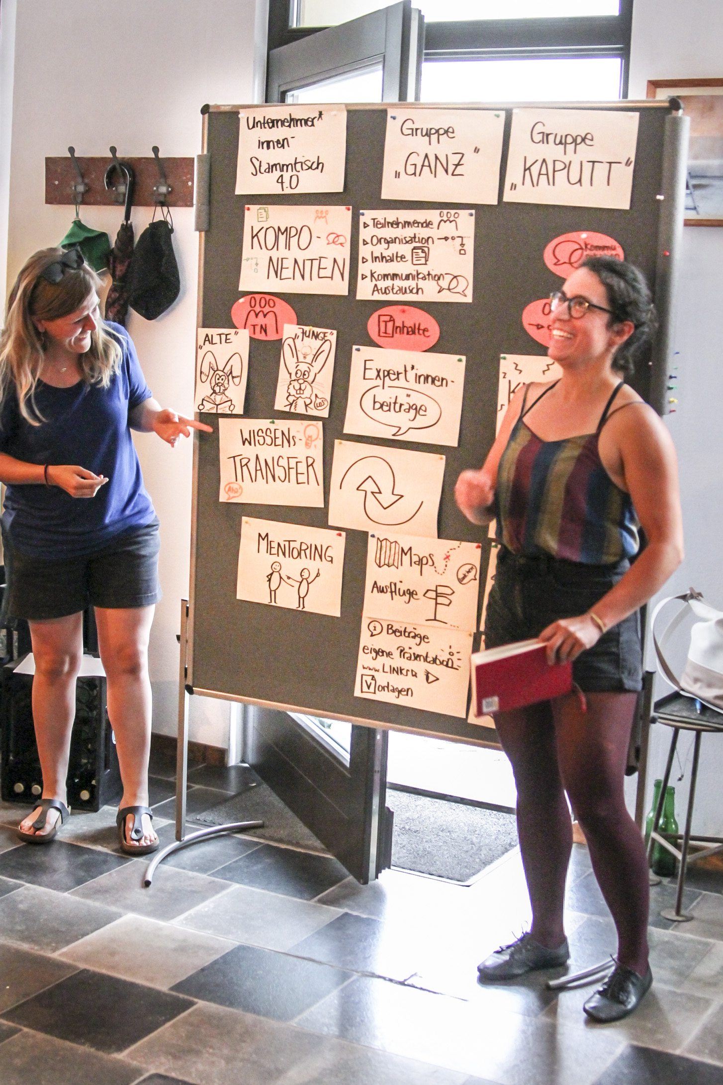 Im Anschluss präsentierten mit Lena Stadler und Franziska Brauner zwei Teilnehmerinnen vom Innovationsnetzwerk, bei dem die Zukunft des Unternehmerstammtisches thematisiert wurde. Mit Design-Thinking-Methoden hatten Claudia Richardt und Frank Basten mithilfe der Teilnehmer Ansätze entwickelt, wie der Unternehmerstammtisch in Zukunft aussehen kann. Dabei ging es neben der Frage nach digitaler Vernetzung auch um USP und Potenziale des aktuellen Formats. Weitere Veranstaltungen zum Thema Innovation und auch zur Fortführung des Projekts folgen.
